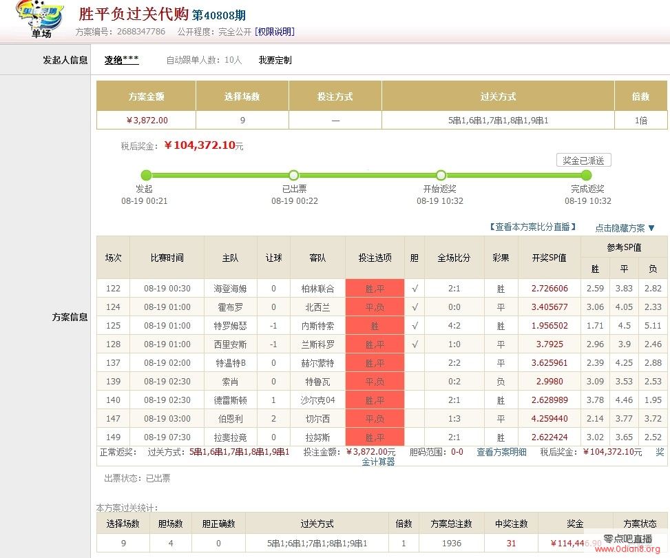 周一竞猜赛事除去英超最后一场切尔西的比赛外,另外德国杯首轮同样结束最后三场比赛,最终切尔西让球出平,沙尔克则爆冷负于乙级球队出局,法乙赛场特鲁瓦豪取三连胜领跑法乙积分榜。零点吧投注平台上,“凌绝***”长串复式拖胆,9场比赛采用5、6、7、8、9串1混合过关,最终9场比赛全部命中,共投注3878元命中114,446元大奖,高手出手果然非同凡响。
