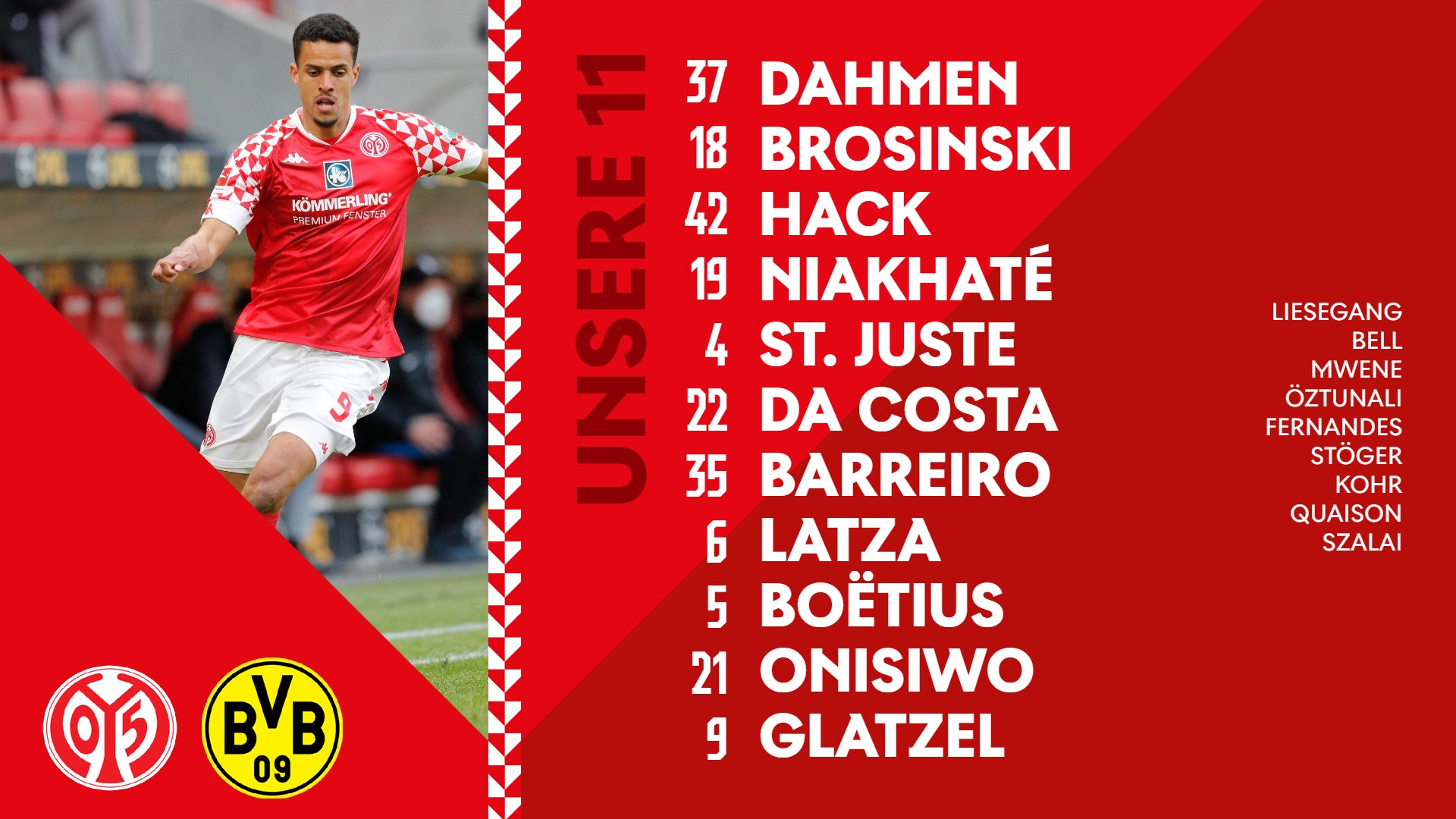 美因茨首发:37-达赫曼、18-布罗辛斯基、42-哈克、19-尼亚哈特、4-圣朱斯特、22-达科斯塔、35-巴雷罗、6-拉萨、5-博埃蒂乌斯、21-奥尼西沃、9-格拉策尔