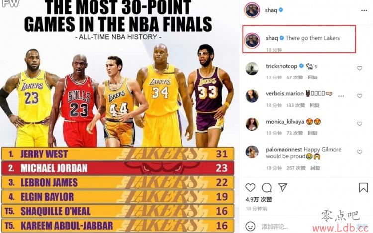 零点吧6月23日讯 NBA名宿奥尼尔今日在其个人社媒晒出了联盟总决赛历史得分30+次数榜,榜单中除了乔丹之外,前五的其余球星都有在湖人效力的经历。