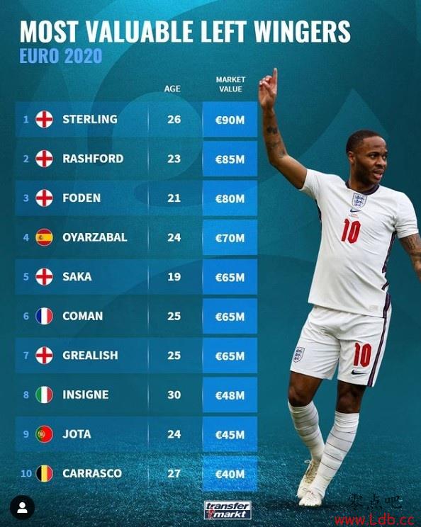 零点吧足球6月23日讯 德转统计了本届欧洲杯各队左边锋的身价榜单,英格兰堪称人才济济,在前7名中有多达5人入选,其中斯特林以9000万欧领跑。