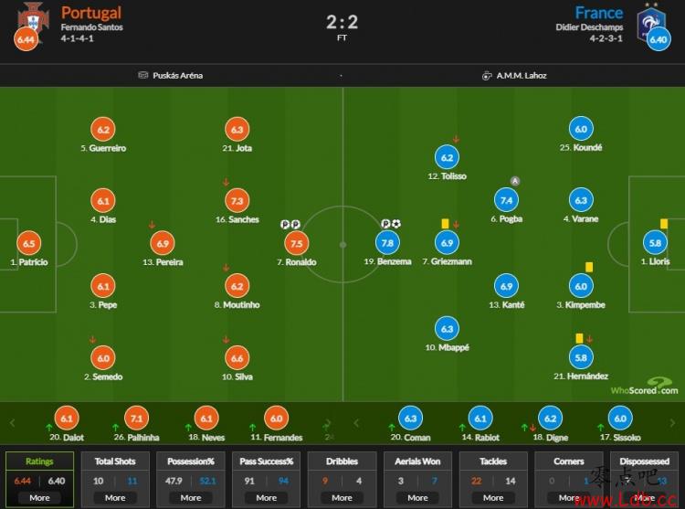 葡萄牙vs法国评分:本泽马7.8分 C罗7.5