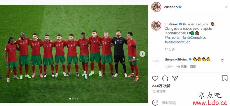 零点吧足球6月24日讯 今天凌晨,葡萄牙在欧洲杯中2-2战平法国,赛后C罗在Instagram上发文鼓励了球队。