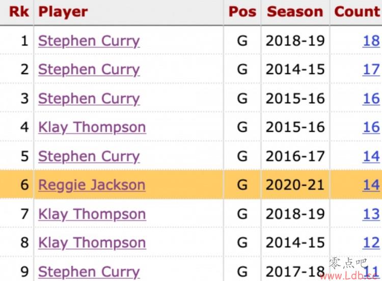 而NBA历史在单赛季季后赛中,单场至少投进3记三分场次最多的球员是2018-19赛季的库里(18场),在该榜单的前9名中,除雷吉外,其余纪录均由库里与克莱-汤普森创造。