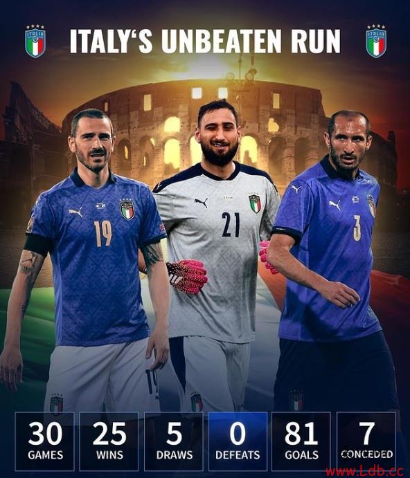 意大利各项赛事已经连续30场不败,共计25胜5平,共计打进81球、仅失7球。他们在本届欧洲杯上也已经取得3连胜,打进7球、没有丢球。