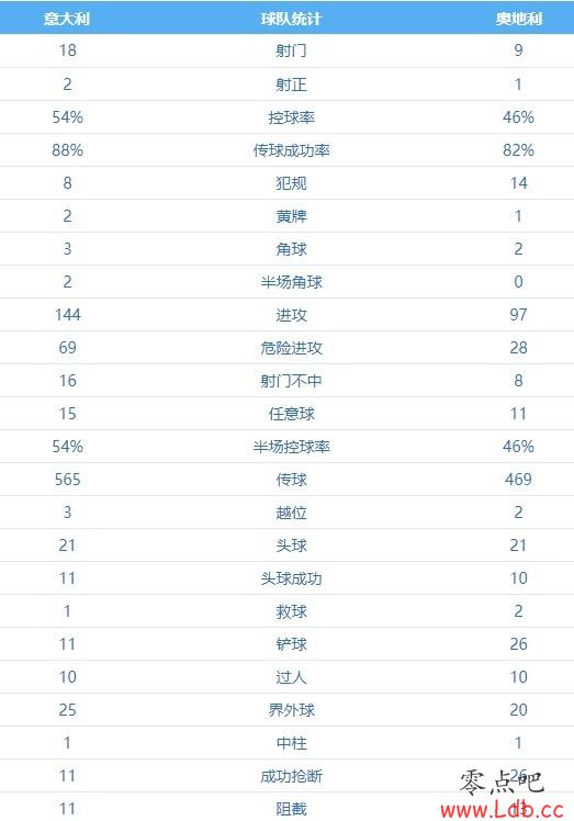 零点吧足球6月27日讯 欧洲杯1/8决赛,意大利vs奥地利,双方常规时间战成0-0平,将在加时赛决出胜负。常规时间内数据如下,两队合轰27脚,仅有3次射正。