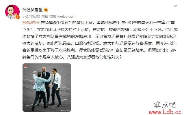 零点吧足球6月27日讯 欧洲杯八分之一决赛,意大利加时2-1战胜奥地利挺进八强,著名评述员詹俊也点评了本场比赛。