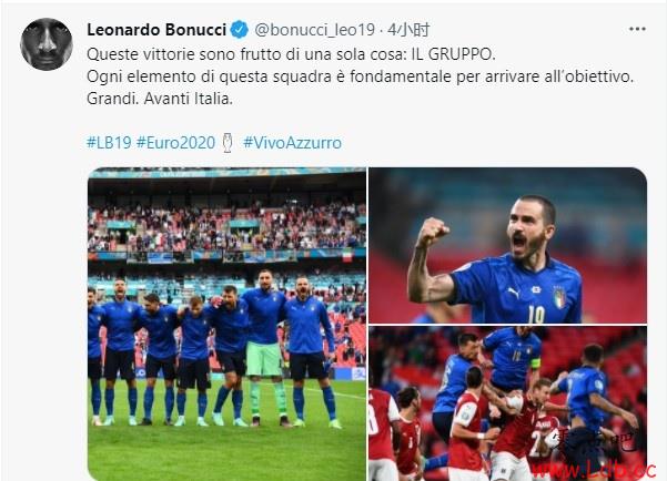 零点吧足球6月27日讯 在欧洲杯八分之一决赛中,意大利通过加时赛2-1战胜奥地利,成功晋级八强。赛后博努奇发推庆祝。