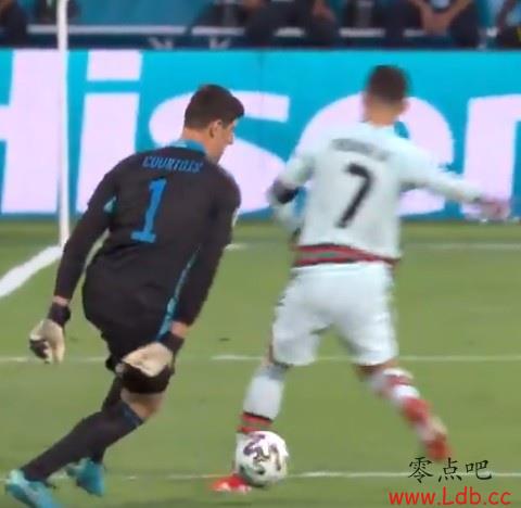零点吧足球6月28日讯 欧洲杯1/8决赛,比利时门将库尔图瓦在面对C罗上抢的时候,冷静趟球晃过对方。