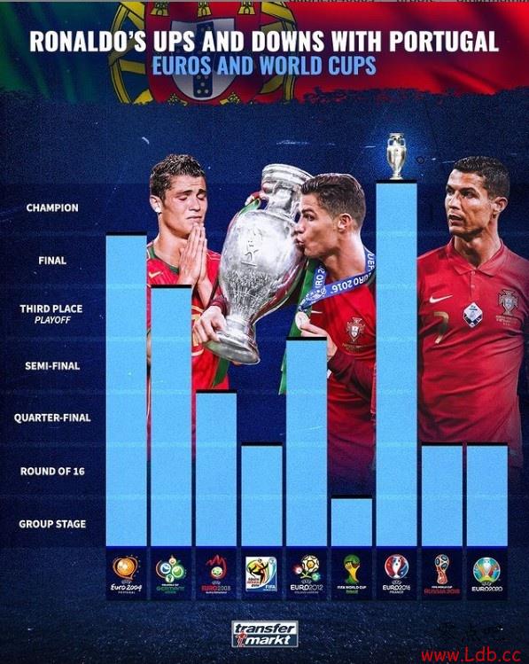 零点吧足球6月28日讯 卫冕冠军葡萄牙在不久前已经被淘汰出局,《德国转会市场》也统计了C罗生涯9届大赛的成绩: