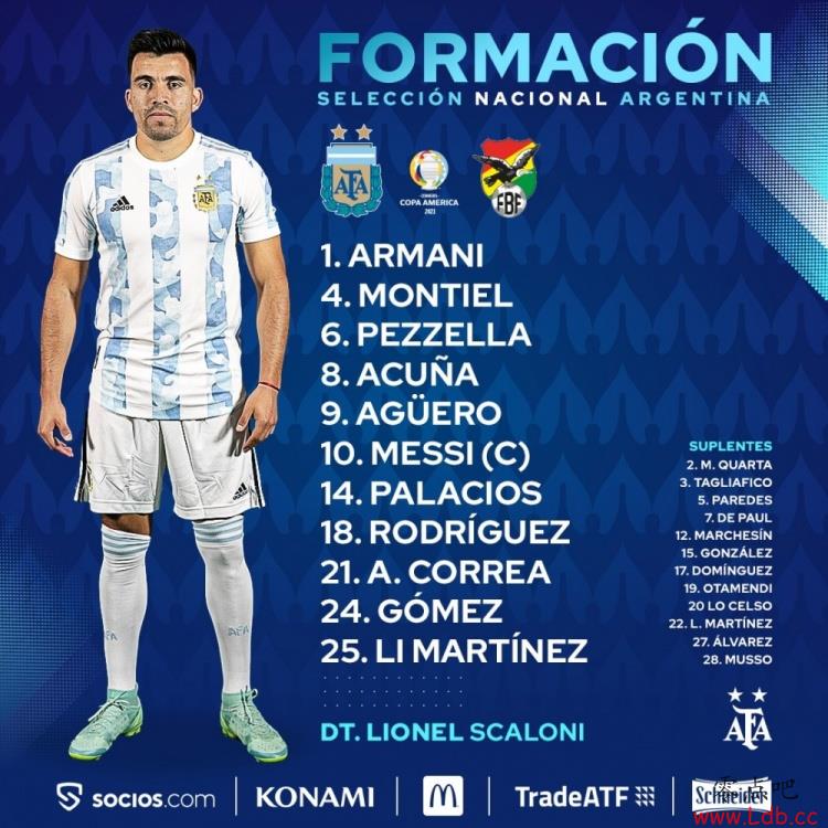 零点吧足球6月29日讯 美洲杯阿根廷vs玻利维亚比赛即将打响。赛前,官方公布了首发阵容。