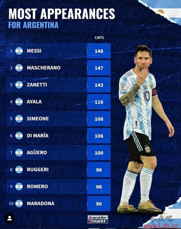 阿根廷队史出场榜:梅西居首、马拉多纳第10 萨内蒂西蒙尼在列