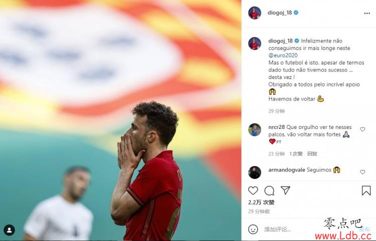 零点吧足球6月29日讯 葡萄牙在欧洲杯1/8决赛中被比利时1-0淘汰出局,葡萄牙前锋若塔今日在instagram发文,感谢球迷的支持。