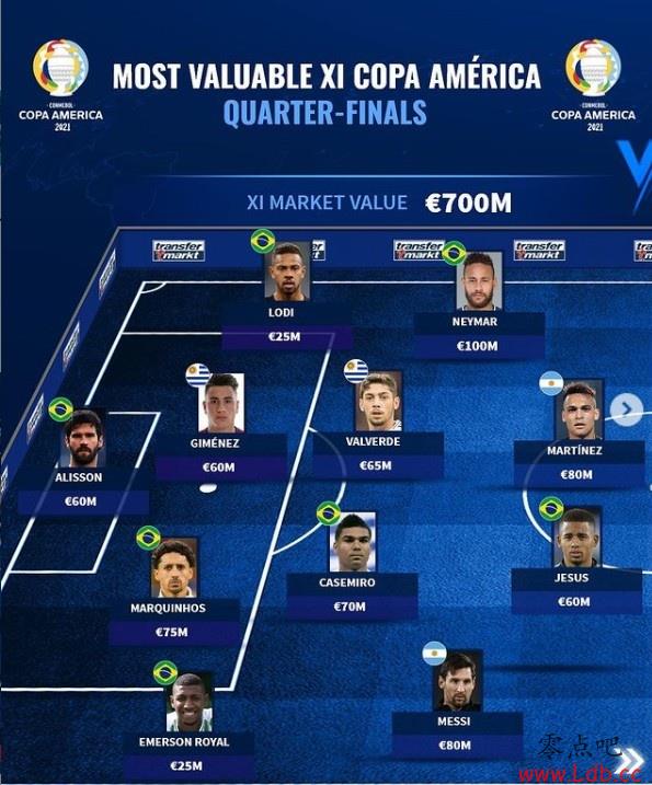 零点吧足球7月2日讯 《德国转会市场》统计了本届美洲杯八强的最贵阵容,总身价高达7亿欧。内马尔领衔巴西7将,阿根廷和乌拉圭也各有2将上榜。