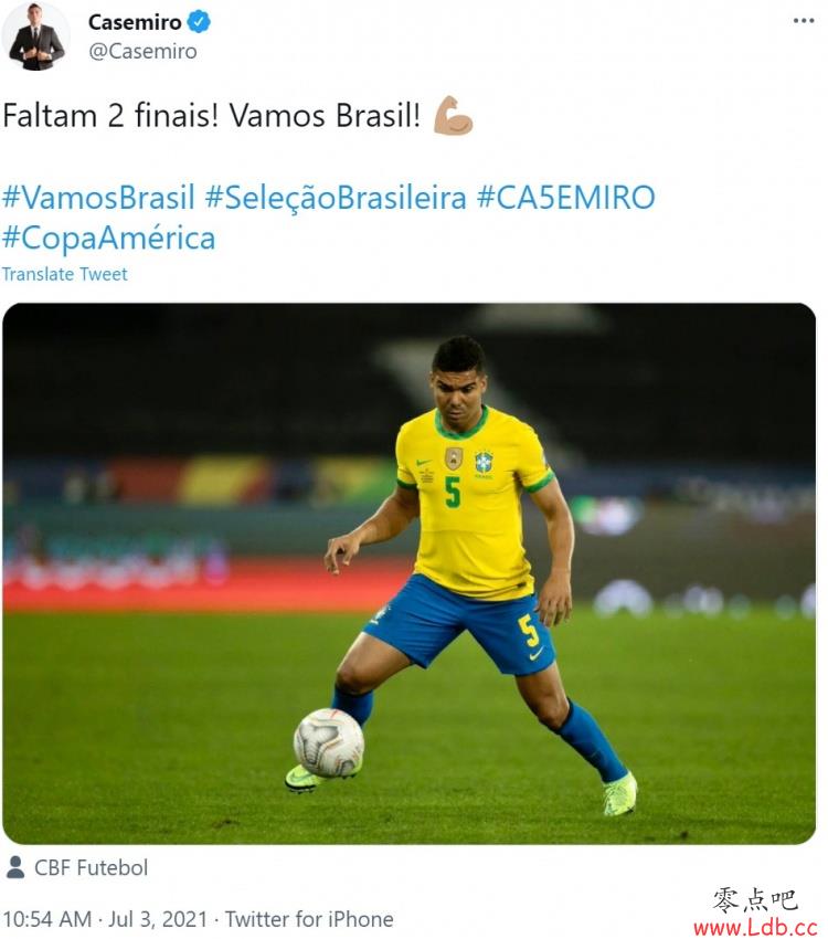 零点吧足球7月3日讯 今天,巴西在美洲杯四分之一决赛中1-0击败智利,赛后卡塞米罗发推鼓励了球队。