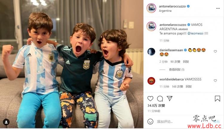 赛后梅西妻子安妞更新INS,她晒出了三个儿子身穿阿根廷球衣庆祝的照片,并写道:“阿根廷加油!我们爱你@梅西”