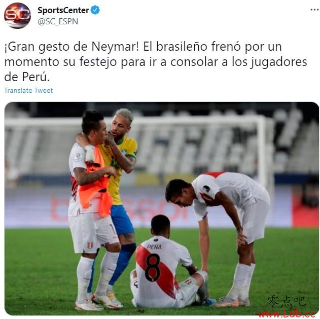 比赛结束后,一些秘鲁球员因被淘汰而情绪激动,内马尔看到后停止了自己的庆祝,前去安慰对手。