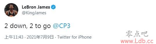 詹姆斯再次发推祝贺保罗:拿下2场了 还差两胜!