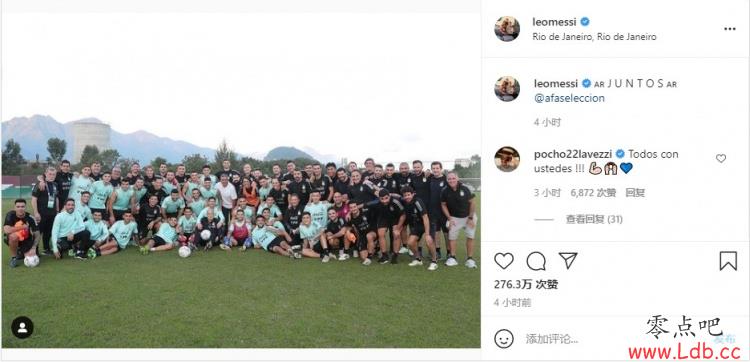 梅西更新INS动态,他晒出了阿根廷全队训练后的大合照,并配文:“全队一起@阿根廷国家队。”