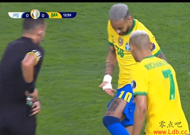 零点吧足球7月11日讯 比赛第14分钟,内马尔被犯规,他向裁判抱怨自己的球裤都被扯烂了。