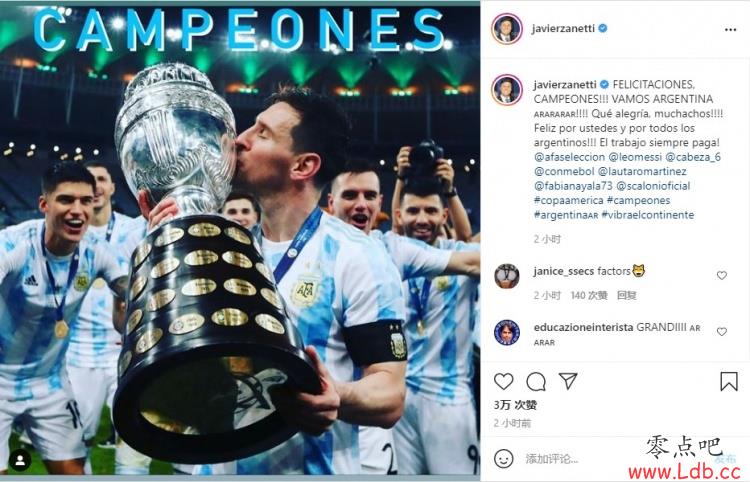 赛后萨内蒂更新INS庆祝夺冠:“恭喜,冠军!!!阿根廷加油!!!伙计们,这太令人高兴了。为你们和所有阿根廷人感到高兴!!!工作总是会得到回报的!”