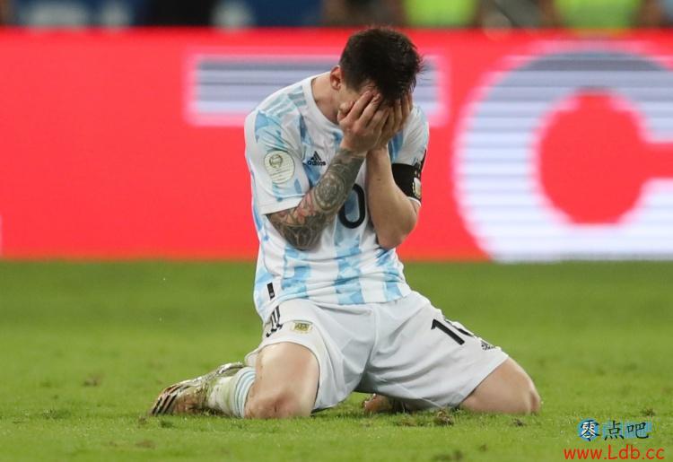零点吧足球7月11日讯 阿根廷1-0击败巴西,终场哨响瞬间,梅西直接跪倒在地,捂脸难以置信冠军就近在眼前。