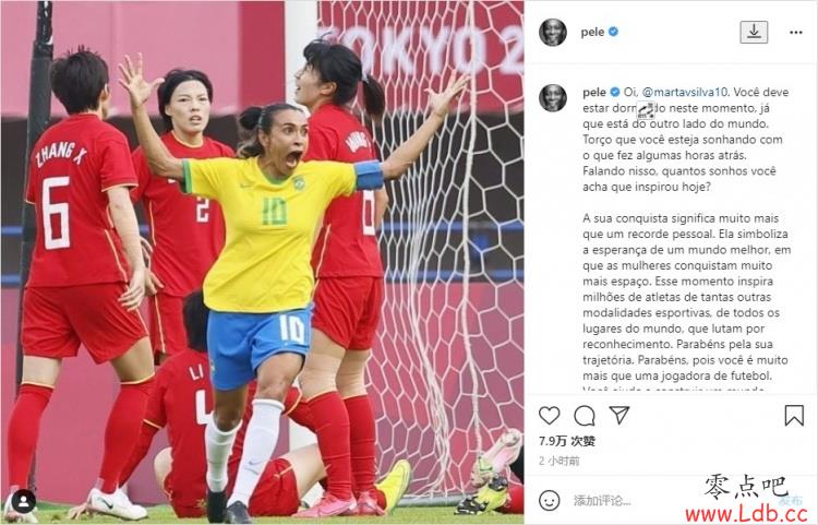零点吧足球7月22日讯 在昨天结束的东京奥运会女足的一场比赛中,巴西女足5-0战胜中国女足。巴西队阵中球星玛塔发挥出色,梅开二度。几小时后, 巴西传奇球星贝利发推赞扬玛塔。