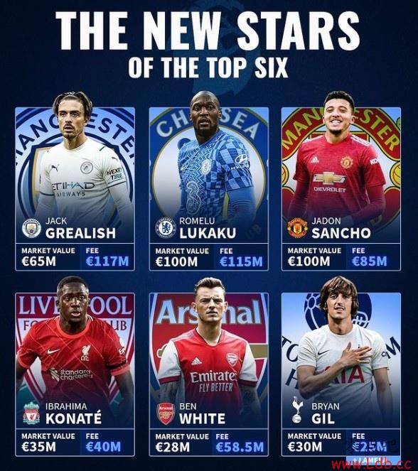 零点吧足球8月14日讯 英超联赛已经战火重燃,《转会市场》也列出了BIG6今夏引进的明星新援情况: