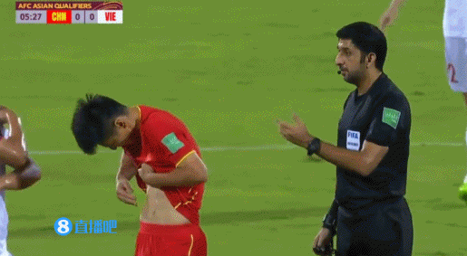 零点吧足球10月7日讯 国足vs越南,武磊突破时被裴进勇放倒,裁判判罚后者犯规。之后的镜头交代,武磊撩起球衣,表情看起来有点疼。