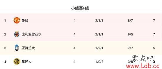 零点吧足球11月3日讯 欧冠小组赛F组第4轮,曼联2-2绝平亚特兰大,比利亚雷亚尔2-0伯尔尼年轻人。