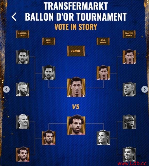 而在半决赛中,球迷们的投票结果则是:莱万胜过梅西、萨拉赫击败C罗。两人也得以会师决赛,球迷仍然可以通过德转的社交平台进行投票。