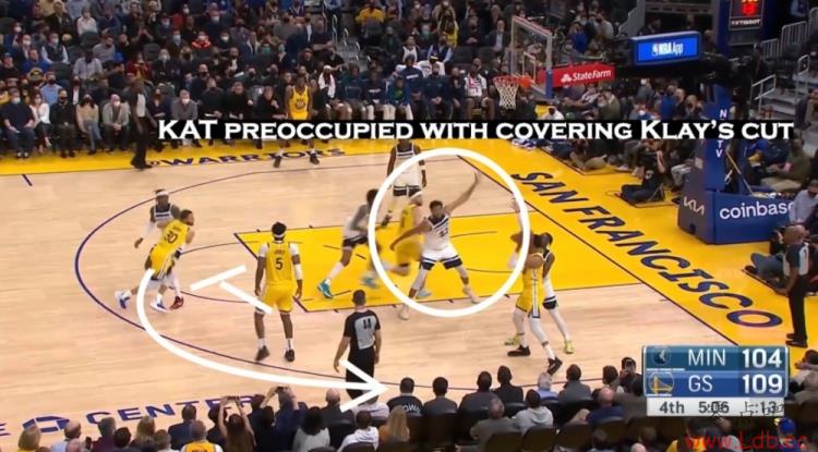 还有下面这个回合,森林狼失误丢球,库里获得了转换三分的机会。但防守人执着于阻止库里的快攻,而此刻克莱正跑向库里的右侧。所有防守者的本能都是去阻止库里,导致克莱获得空位出手的机会。