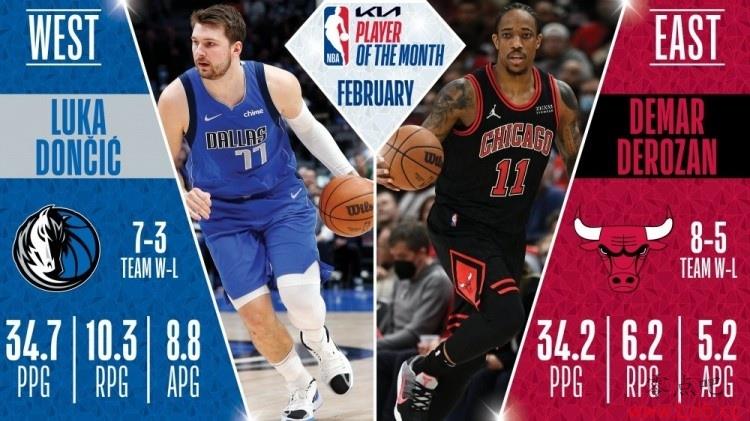 NBA官方公布二月最佳球员:西部东契奇 东部德罗赞