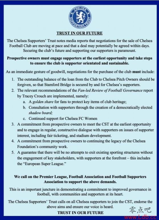 零点吧足球3月5日讯 切尔西球迷组织The Chelsea Supporters’Trust(以下简称CST)发布官方声明,对于俱乐部潜在下家提出若干要求。
