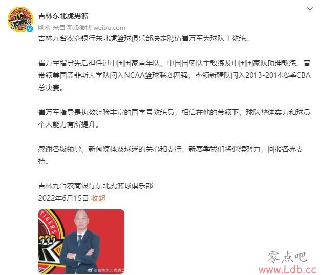 零点吧6月15日讯 今日,吉林男篮官方微博正式宣布聘请崔万军为球队主教练。原文如下: