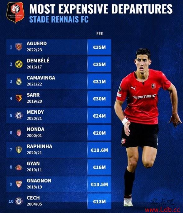 零点吧足球6月20日讯 西汉姆联在不久前官宣以总价3500万欧元签下雷恩中卫阿格尔德,后者也追平了登贝莱所创的雷恩队史转出费纪录。