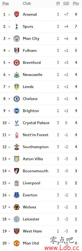 积分榜方面,阿森纳积9分暂居首,热刺积7分第二,曼城积6分第三,切尔西积4分第八,利物浦积2分第十五,曼联积0分垫底。