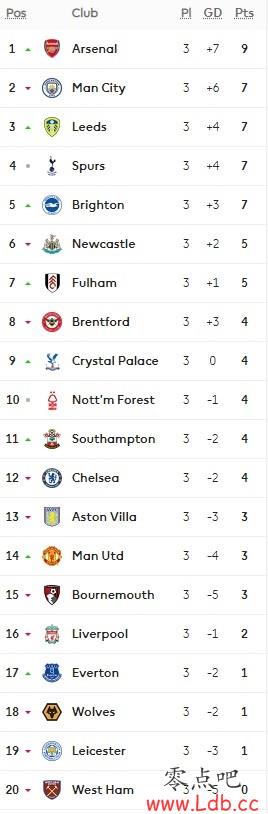 此外,阿森纳积9分居首,曼城积7分第二,热刺积7分第四,切尔西积4分第12。