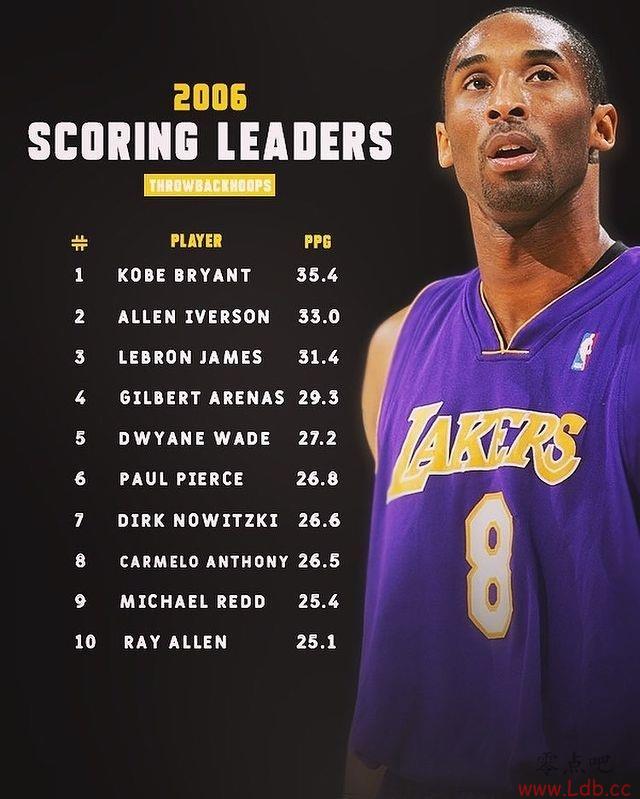 2005-06赛季的联盟得分表演有多疯狂?得分榜前10都超过了场均25分。除了场均35.4分的科比外,竟还有两人达到赛季场均30+,让我们来看看他们都是谁~