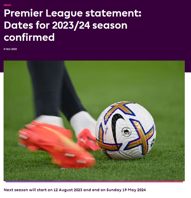 英超官宣23/24赛季时间:2023年8月12日-2024年5月19日