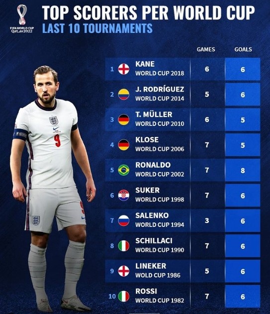 零点吧足球11月14日讯 世界杯还有不到一周就将开战,《转会市场》也列出了近10届赛事金靴的进球情况。罗纳尔多在02年7场打进8球,而萨连科在94年3场打进6球。