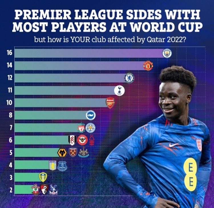 英超各队参加世界杯人数:曼城16人曼联14人,枪手10人利物浦7人