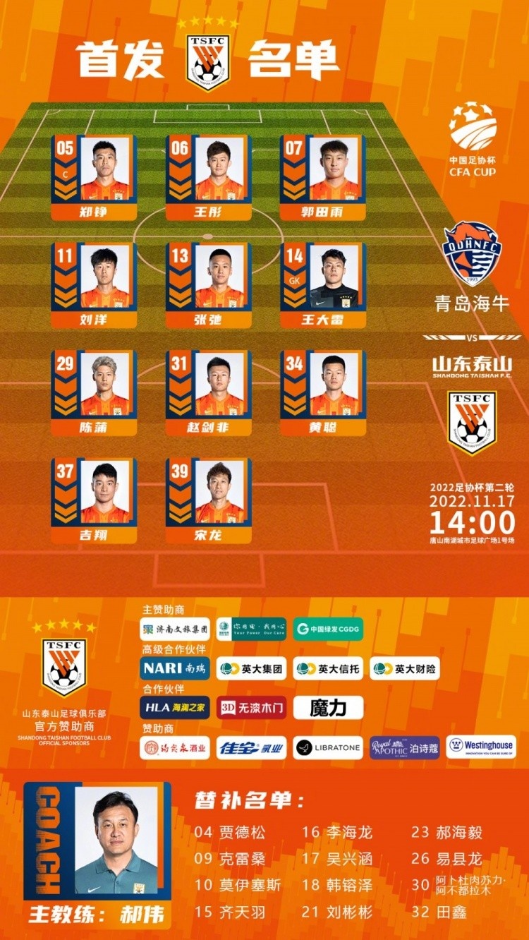 山东泰山首发:14-王大雷、39-宋龙、31-赵剑非(U23)、5-郑铮、6-王彤、11-刘洋、37-吉翔、34-黄聪、29-陈蒲、7-郭田雨(U23)、13-张弛