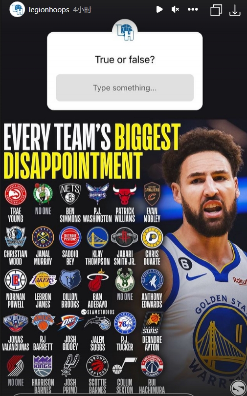 美媒列赛季至今最令人失望球员:湖人詹姆斯 勇士克莱 篮网本西