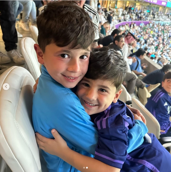 安东内拉晒出自己与孩子们在现场观赛的照片,并写道:“加油阿根廷!!”