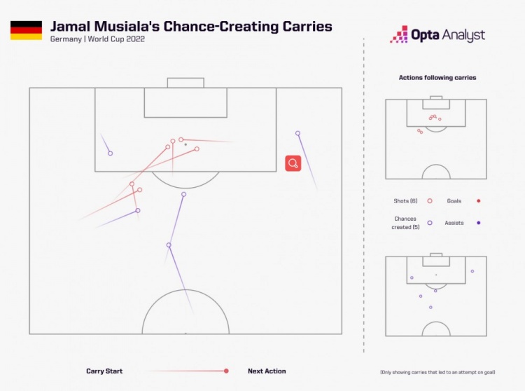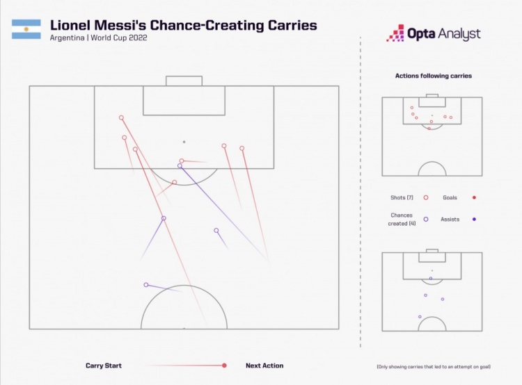 零点吧足球12月6日讯 Opta统计了本届世界杯球员带球后射门+创造机会的数量,并列出前四名榜单,梅西、穆西亚拉11次并列首位。