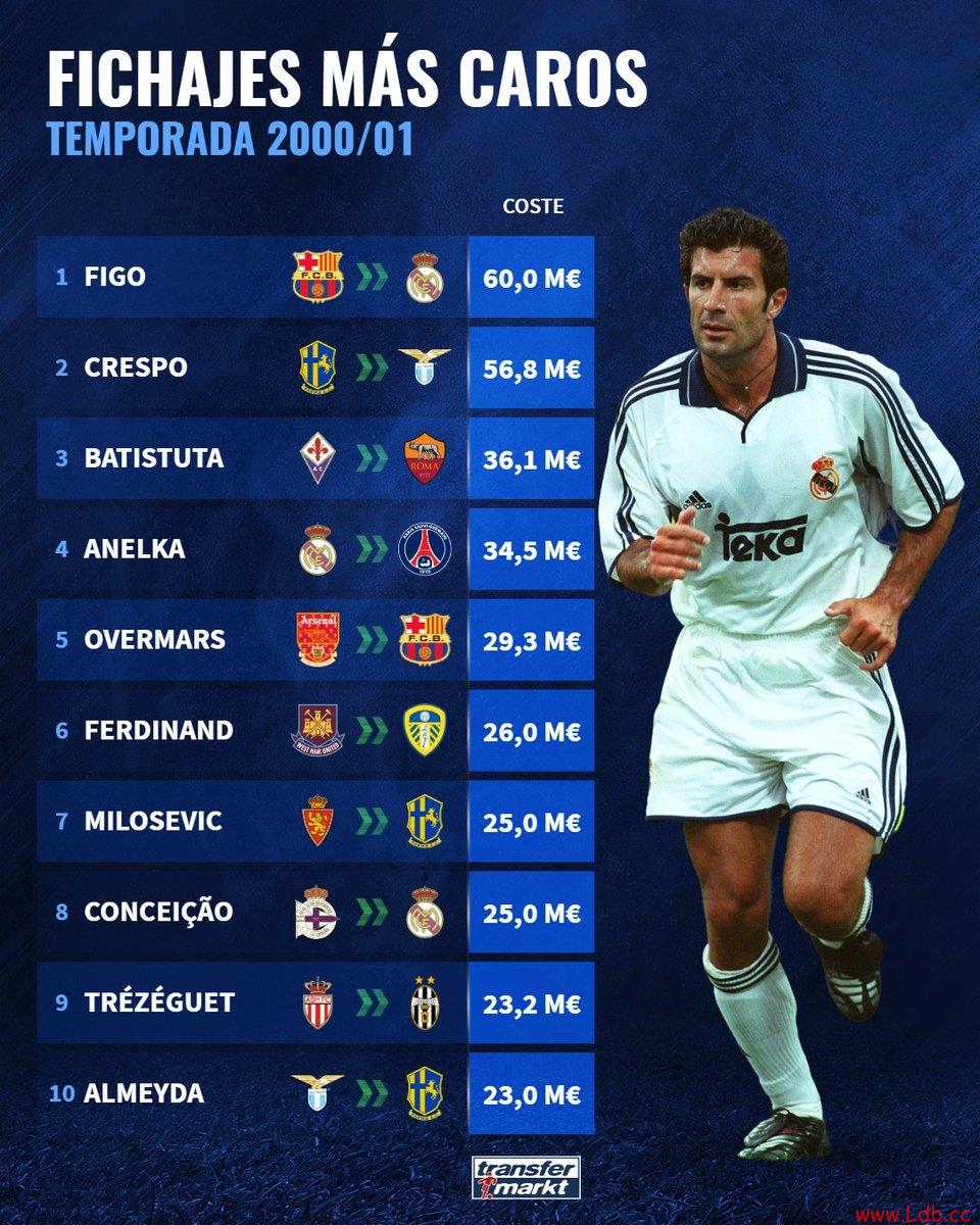 零点吧足球1月24日讯 德国转会市场统计了2000-2001赛季最贵的签约,并列出榜单,菲戈6000万欧从巴萨转会至皇马居首。