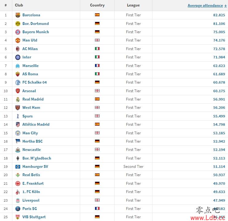 零点吧足球2月7日讯 德国转会市场对五大联赛各球队本赛季主场平均上座人数做出了统计,巴萨主场诺坎普以82825人位列第一,多特81106人居次席,拜仁慕尼黑75005人列第三位。