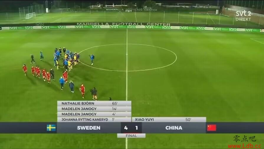 国际友谊赛,中国女足1-4瑞典女足。上半场中国女足开场3分钟丢2球,亚诺吉2射1传,下半场肖裕仪头球扳回一城,比约恩建功。