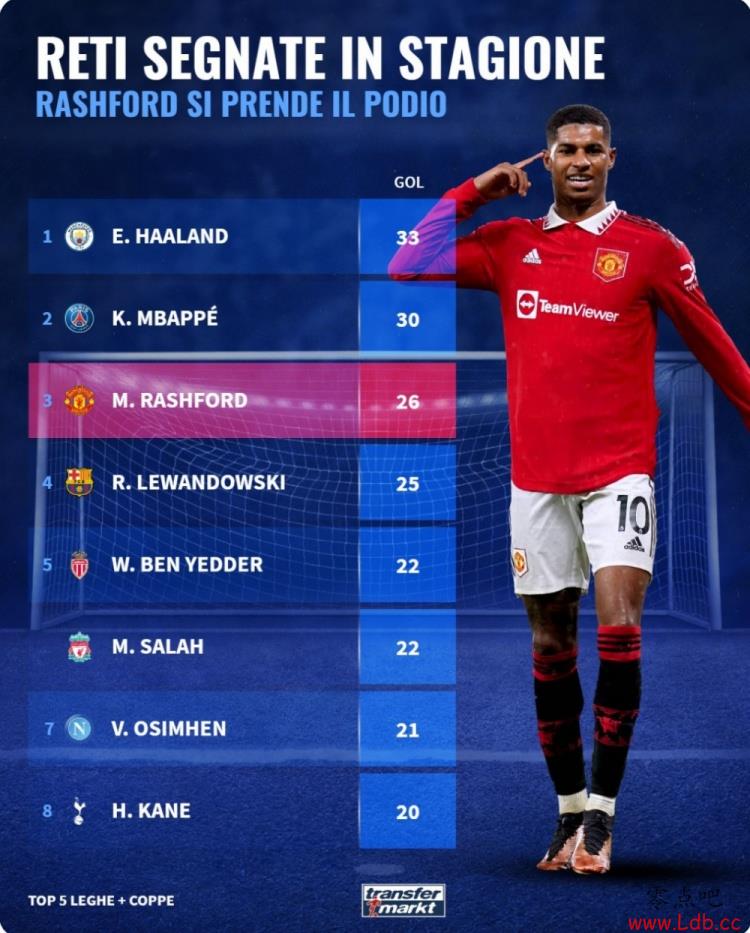 零点吧足球3月10日讯 德国转会市场网站统计了五大联赛球员本赛季的进球数量,并列出榜单,哈兰德以33球居首,姆巴佩、拉什福德排名二三位。