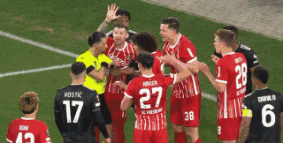 这一幕发生在比赛第57分钟,当时弗赖堡罚任意球传入禁区引发混乱,尤文门将什琴斯尼多次做出扑救力保球门不失。之后弗赖堡球员围住裁判投诉尤文球员犯规,而尤文后卫布雷默等人则上前反驳。